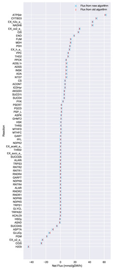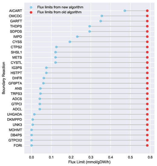 To evaluate the ability of Algorithm 3 to identify lower flux bounds into core metabolism than Algorithm 2, we ran both algorithms on the iJR904 E. coli genome scale model, using exchange and biomass fluxes from the previously published Toya et al. wild-type 5 h sample data [36,37]. We used a standard set of 127 core E. coli reactions that has been previously published as part of the jQMM software tool [31]. These core reactions result in a set of 219 “boundary reactions” that either produce a product consumed by core metabolism, or are reversible and include a reactant consumed by core metabolism. For generating the boundary reaction list, we excluded “currency metabolites” such as NADPH, which participate in core reactions without exchanging carbon. Both Limit Flux to Core algorithms identified a set of 27 reactions with products in core metabolism where the unidirectional component producing a product in core metabolism could not be set to zero. For the old algorithm (Algorithm 2), the minimized upper flux bound found for each was 0.585 mmol·gDW·h, resulting in a maximum sum of fluxes into core metabolism of approximately 15.80 mmol·gDW·h. The new algorithm presented here (Algorithm 3) was able to identify substantially lower flux limits for these same reactions, resulting in a much smaller maximum sum of fluxes into core metabolism of approximately 3.19 mmol·gDW·h. Figure 3 shows a comparison between the flux bounds identified with each method.