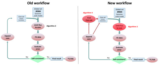 Comparison of old algorithm workflow for 2S-C MFA versus the new workflow using the algorithms presented here. The left panel represents the old workflow (Figure 2 in Garcia Martin et al. [23] and the right panel portrays the new workflow, where the new algorithms are shown with a red overlay. Algorithm 2 presented in this paper represents the old “Limit flux to core” algorithm that is replaced by Algorithm 3 in this paper. Algorithm 4 represents a new way to determine the set of core reactions, which used to be a manual step in the old workflow. Algorithm 4 can also be used to refine the core set after reactions are added as a consequence of the External Labeling Variability Analysis (ELVA)).