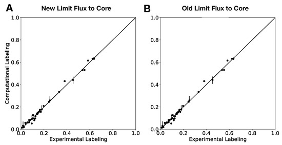 External Labeling Variability Analysis (ELVA) for new (Algorithm 3) and old (Algorithm 2) “Limit flux to core” algorithms shows similar results. The ELVA shows the maximum possible computational error incurred by not adding all reactions to the core, and is used to determine if the core set is complete enough for 2S-C MFA to be self-consistent. The similarity of both plots shows that both algorithms produce similar results for this important part of the method.
