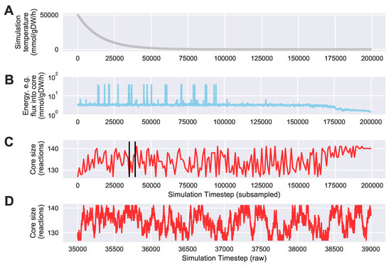 Temperature, energy, and core size during and example Simulated Annealing run to automatically identify an expanded core that minimizes the required sum of fluxes into core metabolism from peripheral metabolism. We started with an example core containing 127 reactions from central carbon metabolism in the iJR904 E. coli genome scale model, using exchange and biomass fluxes from the previously published Toya et al. (2010) wild-type 5 h data [36,37]. We ran the simulation for 200,000 steps using an exponentially decaying annealing schedule starting at a “temperature” of 50,000 mmol·gDW·h and ending at 0.01 mmol·gDW·h. The sum of fluxes into core metabolism was reduced from a starting “energy” of 3.19 mmol·gDW·h to a final value of 1.20 mmol·gDW·h. Shown here is the best (lowest flux into core) result over 64 simulations each started with a different random seed; (A) the annealing schedule “temperatures” over the course of the simulation; (B) a semilogarithmic plot of the “energy level” of the simulation at each iteration, defined as the sum of fluxes into core metabolism as computed with Algorithm 3, subsampled every 100 steps; (C) the size of the core in reactions, subsampled every 1000 steps. Vertical black lines indicate the zoomed in timestep range that is used for panel (D); (D) the size of the core in reactions, zoomed in from part (C), from simulation timestep 35,000 to timestep 39,000 without any subsampling.