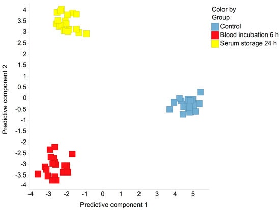 After performing a MS-based metabolomics broad profiling approach, we conducted a supervised orthogonal projection to latent structures-discriminant analysis (OPLS-DA) to get a first overview on the data set (Figure 1). The resulting plot revealed a clear clustering of the different sample processing conditions (control, blood incubation for 6 h, and serum storage for 24 h) with a cumulative Q2 value of 0.87. This clustering behavior was not observed in an unsupervised principal component analysis (not shown), indicating that inter-individual variability and sex have a greater impact on the serum metabolome than the applied confounders.