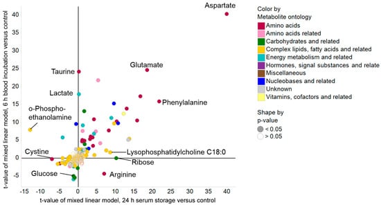Scatter plot of t-values using ANOVA to visualize effects of prolonged blood incubation and extended serum storage versus control. The magnitude of t-values is indicative for the difference in metabolite values relative to their variance, and as such, a high absolute t-value represents a more robust change.