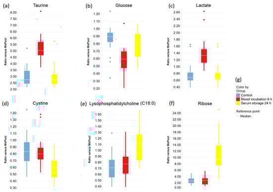 The effects of prolonged blood incubation and extended serum storage on selected metabolites are represented by boxplots. (a–c) Metabolite levels that were significantly changed by prolonged blood incubation; (d–f) Metabolite amounts that were significantly changed by extended serum storage; (g) Legend for the boxplots in (a–f).