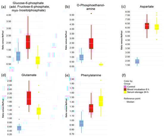 Selected metabolites that were affected by both prolonged blood incubation and extended serum storage. (a–e) Boxplots of metabolite levels that were significantly changed by both prolonged blood incubation and extended serum storage; In (a), the term “add.” (additional) means that quantification could be influenced by minor levels of other metabolites with identical analytical characteristics with respect to the quantitation method; (f) Legend for the boxplots in (a–e).