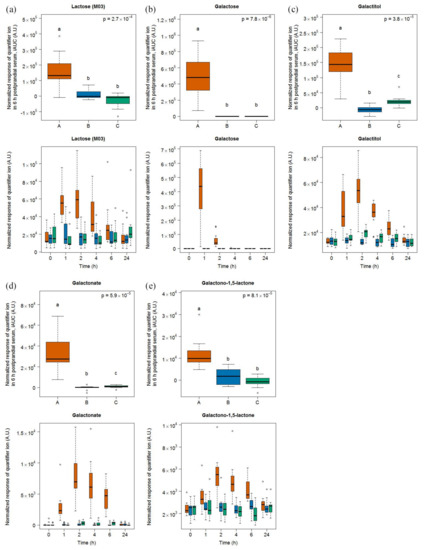 GC-MS-based postprandial behaviour of lactose (a), galactose (b), galactitol (c), galactono-1,5 lactone (d), and galactonate (e) after milk intake (orange) when compared to cheese (blue) and soy drink (green) intake. Upper graph of panels: 6h-iAUC. Lower graph of panels: time-points analysis from 0 to 24 h. The p values in the upper graphs are based on a Kruskal-Wallis test and have been adjusted for multiple testing. If the Kruskal-Wallis test was significant (p < 0.05), pairwise comparisons were conducted using a Conover-Inman test. Different letters (abc) denote significant differences based on a p value < 0.05.
