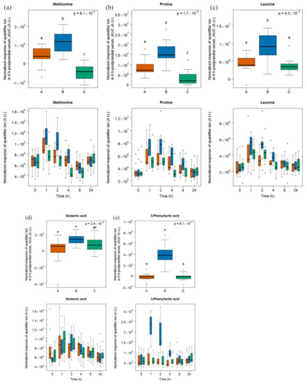 GC-MS-based postprandial behaviour of methionine (a), proline (b), leucine (c), glutamic acid (d), and 3-phenyllactic acid (e) after cheese intake (blue) when compared to milk (orange) and soy drink (green) intake. Upper graph of panels: 6h-iAUC; Lower graph of panels: time-points analysis from 0 to 24 h. The p values in the upper graphs are based on a Kruskal-Wallis test and have been adjusted for multiple testing. If the Kruskal-Wallis test was significant (p < 0.05), pairwise comparisons were conducted using a Conover-Inman test. Different letters (abc) denote significant differences based on a p value < 0.05.