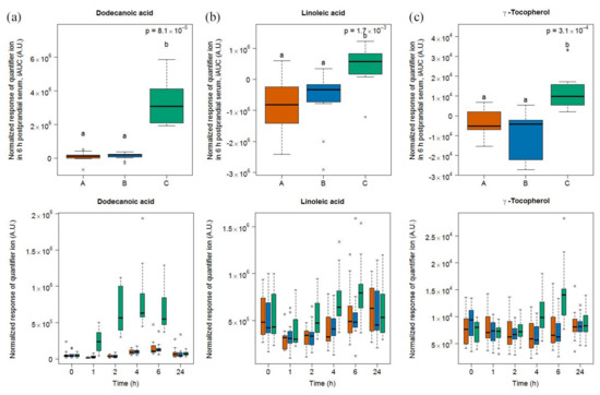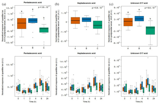 GC-MS-based postprandial behavior of pentadecanoic acid C15:0 (a), heptadecanoic acid C17:0 (b), and an unknown C17 acid (c), after milk (orange), cheese (blue), and soy drink (green) intake. Upper graph of panels: 6h-iAUC; Lower graph of panels: time-points analysis from 0 to 24 h. The p values in the upper graphs are based on a Kruskal-Wallis test and have been adjusted for multiple testing. If the Kruskal-Wallis test was significant (p < 0.05), pairwise comparisons were conducted using a Conover-Inman test. Different letters (abc) denote significant differences based on a p value < 0.05.
