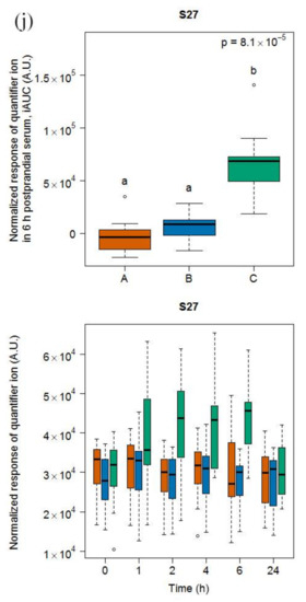 An analysis of this region revealed slower postprandial kinetics than the other selected metabolites, reaching peak concentration around 4 h after intake and remaining at elevated levels at 6 h (lower graph in Figure 8).