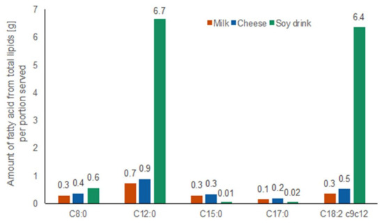 Amount of octanoic acid C8:0, dodecanoic acid C12:0, pentadecanoic acid C15:0, heptadecanoic acid C17:0, and linoleic acid C18:2 of total lipids in test foods per portion served measured by GC-FID. Milk: orange bars, cheese: blue bars, soy drink with added vegetable fat: green bars.