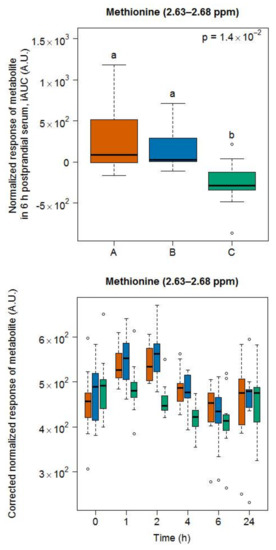 A doublet at 2.63–2.68 ppm indicated that methionine was discriminative between dairy products (i.e., milk and cheese) and the soy drink (Figure 6). However, in contrast to GC-MS, which discriminated each of the three food groups (see Figure 2), NMR did not reveal a difference in the postprandial response of the subjects to milk and cheese intake.