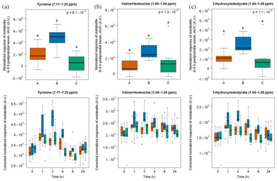 NMR-based postprandial behaviour of tyrosine (a), valine and isoleucine (b), and 3-hydroxyisobutyrate (c) after cheese intake (blue) when compared to milk (orange) and soy drink (green) intake. Upper graph of panels: 6h-iAUC; Lower graph of panels: time-points analysis from 0 to 24 h. The p values in the upper graphs are based on a Kruskal-Wallis test and have been adjusted for multiple testing. If the Kruskal-Wallis test was significant (p < 0.05), pairwise comparisons were conducted using a Conover-Inman test. Different letters (abc) denote significant differences based on a p value < 0.05.