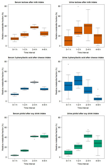 In order to visualize possible differences in the behaviour of unmetabolized candidate FIBs, the postprandial serum and urinary GC-MS profiles of lactose (after milk intake), 3-phenyllactic acid (after cheese intake), and pinitol (after soy drink intake) were visually compared (Figure 9). GC-MS data was used since all three metabolites were found in both biofluids by this platform. For each time interval (0–1 h, 1–2 h, 2–4 h, 4–6 h), the fractional contribution, in percent of each metabolite, is shown relative to the normalized cumulative response measured over the 6 h postprandial period. Whereas lactose (upper panels) and 3-phenyllalctic acid (middle panels) reached peak values in serum (left panels) in the 2–4 h time interval, pinitol values (lower panels) were still elevated during the 4–6 h time interval. The urine data (right panels), on the other hand, is characterized by a larger variability. A delayed expression of pinitol, compared to lactose and 3-phenyllactic acid, appears, however, to be evident during the 1–2 h interval. Of note, the AUCs values for serum are approximated using the trapezoid method, i.e., with linear interpolations between the time points 0, 1, 2, 4, and 6 h. As such, an exact comparison of the dynamic behaviour of each metabolite between serum and urine is limited.
