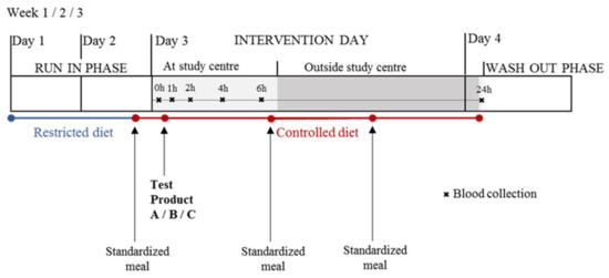 During a 2-day run-in phase, the volunteers followed a restricted diet (no dairy products, no fermented products, no soy products, and no products of bovine origin) and, during the intervention phase up to 24 h, the diet was fully controlled by providing three times a standardized meal apart from the test product [25] as shown in Figure 10.
