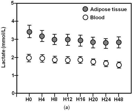 Adipose tissue and blood lactate levels for the entire 48-h period are shown in Figure 1a.