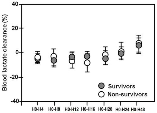 Figure 2. Mean (± SE) blood lactate clearances in survivors (closed circles) and non-survivors (open circles) over 48 h.
