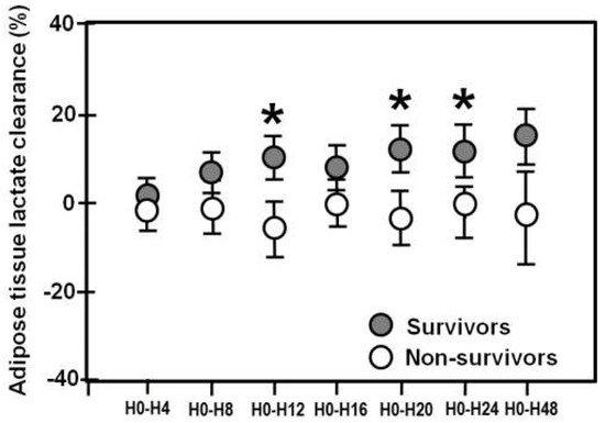 Figure 3. Mean (± SE) adipose tissue lactate clearances in survivors (closed circles) and non-survivors (open circles) over 48 h. Asterisks denote statistically significant differences between the two groups.