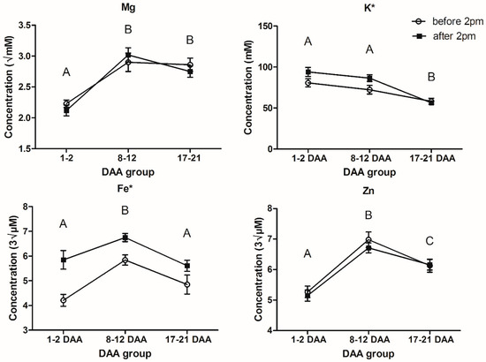 Mean concentrations ± standard error of Mg, K, Fe and Zn in the phloem exudate sampled before and after 14:00 for different maturities. Letters indicate significant differences between maturities at p < 0.05; * indicates significant differences between time of day at p < 0.05 (DAA, days after anthesis; sample sizes are listed in Table S1, while Table S3 presents the mean and SE for elemental concentrations at each sampling point).