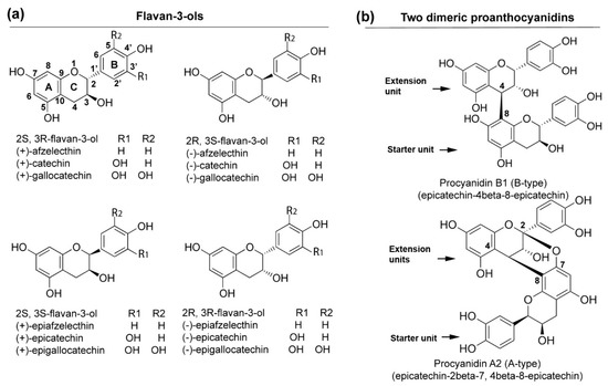 Schemes of flavan-3-ols (monomers) and dimeric proanthocyanidins: (a) four types of stereo configurations of different monomeric flavan-3-ols, such as (+)-catechin, (−)-epicatechin, (−)-epigallocatechin, and (−)-epicatechin; (b) two examples of dimeric proanthocyanidins, procyanidin A2 (A-type) and procyanidin B1 (B-type).