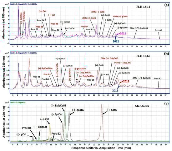 Comparison of metabolite peak profiles between berry extracts of FLH 13-11 and FLH 17-66 in two years and nine standards. Metabolite peaks detected by HPLC were recorded at 280 nm. (a) Two chromatograms show peaks annotated to be flavan-3-ols and dimeric PAs in berries of FLH 13-11 from the 2011 and 2012 cropping years. (b) Two chromatograms show peaks annotated to be flavan-3-ols and dimeric PAs in berries of FLH 17-66 from the 2011 and 2012 cropping years. (c) A chromatogram shows retention times of nine standards including five flavan-3-ol aglycones, two conjugates, and two dimeric PA standards (procyanidin B1 and B2). Compound peaks detected in one variety only and two varieties are highlighted with red and black color, respectively. Standards and abbreviations, (+)-catechin (Cat), (−)-epicatechin (EpiCat), (−)-gallocatechin (gCat), (−)-epigallocatechin (EpigCat), (−)-catechin gallate (CatG), (−)-epigallocatechin gallate (EpigCatG), (−)-gallocatechin gallate (gCatG), procyanidin B1 (Proc B1), and procyanidin B2 (Proc B2). Abbreviation for compounds annotated by HPLC-qTOF-MS/MS analysis described below, (+)-Cat3Glu: (+)-catechin 3-glucoside, (−)-Cat3Glu: (−)-catechin 3-glucoside, (+)-EpiCat: (+)-epicatechin, (+)-gCat3Glu: (+)-gallocatechin 3-glucoside, (−)-gCat3Glu: (−)-gallocatechin 3-glucoside, (+)-EpigCat3Glu: (+)-epigallocatechin 3-glucuside, (−)-EpigCat3Glu: (−)-epigallocatechin 3-glucoside, OMe(+)-CatG: Methyl-O-(+)-catechin-3-gallate, OMe(−)-CatG: Methyl-O-(−)-catechin-3-gallate, OMe(−)-gCatG: Methyl-O-(−)-gallocatechin-3-gallate, OMe(+)-EpigCatG: Methyl-O-(−)-epigallocatechin-3-gallate, OMe(−)-EpigCatG: Methyl-O-(−)-epigallocatechin-3-gallate, and OMe(+/−)-EpiCatG: Methyl-O-(+/−)-epicatechin-3-gallate. Proc B4, B5, B6, B7, B8, and A2: procyanidin B4, B5, B6, B7, B8, and A2.