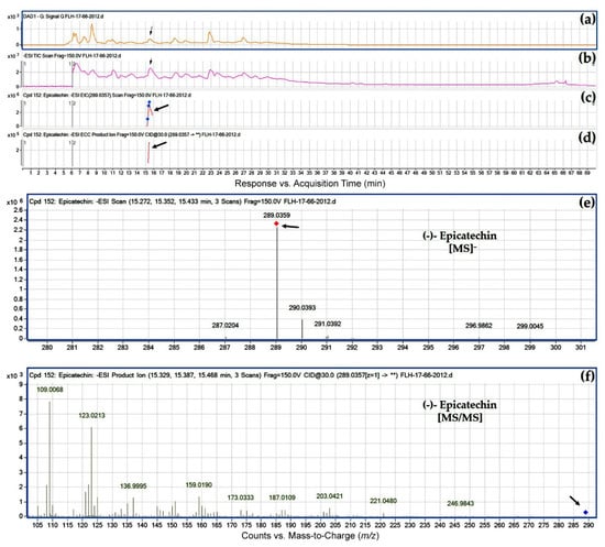Extracted ion chromatogram (EIC) of primary mass spectrum (MS1) and m/z features of secondary ion fragments (MS2) derived from LC-MC/MS annotate this peak to be (−)-epicatechin (MW, 290.26). (a) Chromatogram of FLH 17-66 extract (2012) recorded at 280 nm; (b) total ion chromatogram of FLH 17-66 extract (2012); (c) EIC of primary ion 289.0357 [M − H]¯; (d) enhanced charge capacity (ECC) ion product for m/z 289.0357; (e) a MS profile showing an extracted m/z value, 289.0359; and (f) fragments from collision-induced dissociation (CID) of m/z 289.0359 showing m/z 109.0068, 123.0213, 136.9995, 151.0132, 203.0421, and 246.9843 (Table 1).