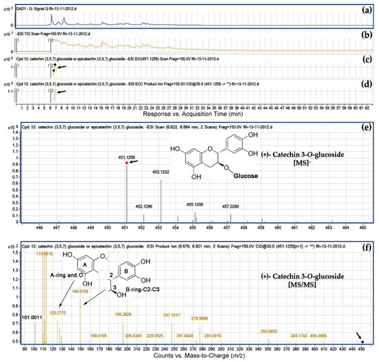 Extracted ion chromatogram (EIC) of primary mass spectrum (MS1) and m/z features of secondary ion fragments (MS2) derived from LC-MC/MS annotate this peak to be (+)-catechin 3-O-glucoside (MW, 452.41). (a) Chromatogram of FLH 13-11 extracts (2012) recorded at 280 nm; (b) total ion chromatogram of FLH 13-11 extracts (2012); (c) EIC of primary ion 451.1255 [M − H]¯; (d) enhanced charge capacity (ECC) ion product for m/z 451.1255; (e) a MS profile showing an extracted m/z value, 451.1256 and (f) fragments from collision-induced dissociation (CID) of m/z 451.1256 showing m/z 109.0471, 110.9518, 125.0775, 149.0708, 169.0195, and 247.1017 (Table 1).