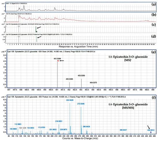 Extracted ion chromatogram (EIC) of primary mass spectrum (MS1) and m/z features of secondary ion fragments (MS2) derived from LC-MC/MS annotate this peak to be (−)-epicatechin 3-O-glucoside (MW, 452.41). (a) Chromatogram of FLH 17-66 extracts (2012) recorded at 280 nm; (b) total ion chromatogram of FLH 17-66 extract (2012); (c) EIC of primary ion 451.0918 [M − H]¯; (d) enhanced charge capacity (ECC) ion product for m/z 451.0918; (e) a MS profile showing an extracted m/z value, 451.0368; and (f) fragments from collision-induced dissociation (CID) of m/z 451.0368 showing m/z 124.9861, 172.9705, 244.9449, 272.9346, 286.9428, and 300.9102 (Table 1).