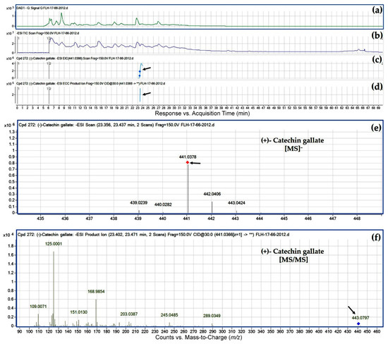 Extracted ion chromatogram (EIC) of primary mass spectrum (MS1) and m/z features of secondary ion fragments (MS2) derived from LC-MC/MS annotate this peak to be (+)-catechin gallate (MW, 442.37). (a) Chromatogram of FLH 17-66 extracts (2012) recorded at 280 nm absorbance; (b) total ion chromatogram of FLH 17-66 extract (2012); (c) EIC of primary ion 441.0366 [M − H]¯; (d) enhanced charge capacity (ECC) ion product for m/z 441.0366; (e) a MS profile showing an extracted m/z value, 441.0378; and (f) fragments from collision-induced dissociation (CID) of m/z 441.0378 showing m/z 109.0071, 125.0001, 136.9989, 151.0130, 179.0047, 245.0485, and 289.0349 (Table 1).