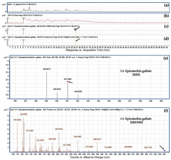 Extracted ion chromatogram (EIC) of primary mass spectrum (MS1) and m/z features of secondary ion fragments (MS2) derived from LC-MC/MS annotate this peak to be (−)-epicatechin gallate (MW, 442.37). (a) Chromatogram of FLH 17-66 extract (2012) recorded at 280 nm; (b) total ion chromatogram of FLH 17-66 extract (2012); (c) EIC of primary ion 441.0366 [M − H]¯; (d) enhanced charge capacity (ECC) ion product for m/z 441.0366; (e) a MS profile showing an extracted m/z value, 441.0362; and (f) fragments from collision-induced dissociation (CID) of m/z 441.0362 showing m/z 109.0065, 123.0209, 137.0003, 151.0112, 179.0064, 245.0452, 271.0298, 289.0319, 313.9907, 331.9910, and 358.9829 (Table 1).