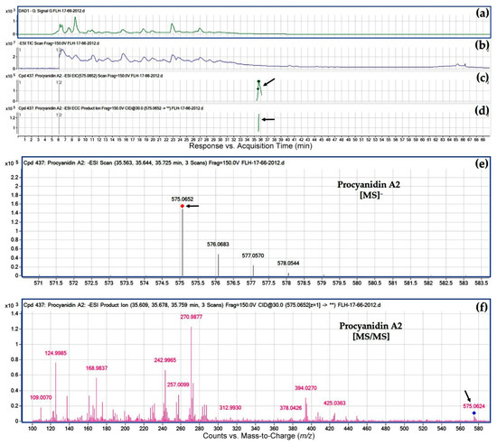 Extracted ion chromatogram (EIC) of primary mass spectrum (MS1) and m/z features of secondary ion fragments (MS2) derived from LC-MC/MS annotate this peak to be procyanidin A2 (MW, 576.51). (a) Chromatogram of FLH 17-66 extract (2012) recorded at 280 nm; (b) total ion chromatogram of FLH 17-66 extract (2012); (c) EIC of primary ion 575.0652 [M − H]¯; (d) enhanced charge capacity (ECC) ion product for 575.0652 m/z; (e) A MS profile showing an extracted m/z value, 575.0652; and (f) fragments from collision-induced dissociation (CID) of m/z 575.0652 showing m/z 109.0070, 124.9985, 136.9988, 152.9935, 168.9837, 242.9965, 270.9877, 285.0011, 296.9985, 327.0119, and 425.0363 (Table 1).