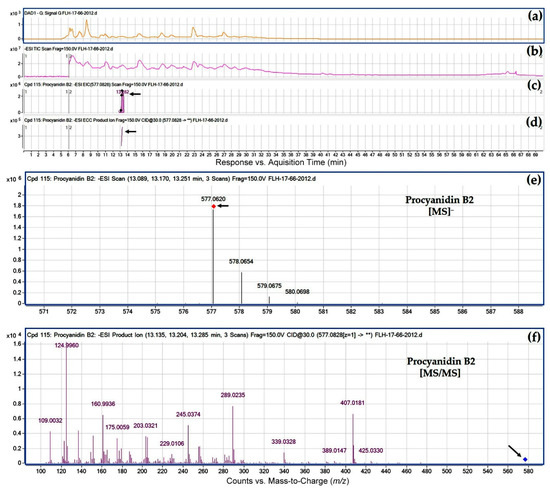 Extracted ion chromatogram (EIC) of primary mass spectrum (MS1) and m/z features of secondary ion fragments (MS2) derived from LC-MC/MS annotate this peak to be procyanidin B2 (MW, 578.52). (a) Chromatogram of FLH 17-66 extract (2012) recorded at 280 nm; (b) total ion chromatogram of FLH 17-66 extract (2012); (c) EIC of primary ion 577.0828 [M − H]¯; (d) enhanced charge capacity (ECC) ion product for m/z 577.0828; (e) a MS profile showing an extracted m/z value, 577.0620; and (f) fragments from collision-induced dissociation (CID) of m/z 577.0620 showing m/z 109.0032, 124.9960, 136.9946, 151.0073, 160.9936, 245.0374, 289.0235, 407.0181, and 425.0330 (Table 1).