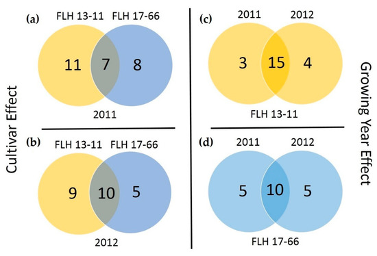 A Venn diagram showing effects of cultivars and cropping years on formation of 30 annotated metabolites. Arabic numerals are flavaan-3-ols and dimeric proanthocyanidins extracted from samples. Yellow and blue colors represent FLH13-11 and FLH 17-66, respectively.