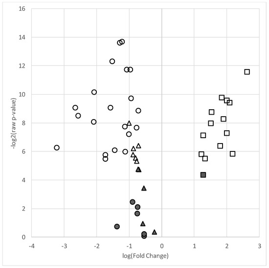 Volcano plot of lipid species in the AAP-treated group relative to the mood stabilizer group. Plot depicts log of –log2 p-value (y-axis) versus log base 2 of fold change (x-axis) of each individual lipid included in the analyses. Symbols higher on the y-axis indicate a more significant p-value and the greater distance from the center (“0”) indicates a decrease (negative log fold change) or increase (positive fold change) in the lipid level of the AAP group relative to the mood stabilizer group. ● = total fatty acids, ▲ = phosphatidylcholines, ■ = ceramides. Filled shapes are non-significant and empty (non-filled) shapes are significant based on a false discovery (q-value < 0.05).