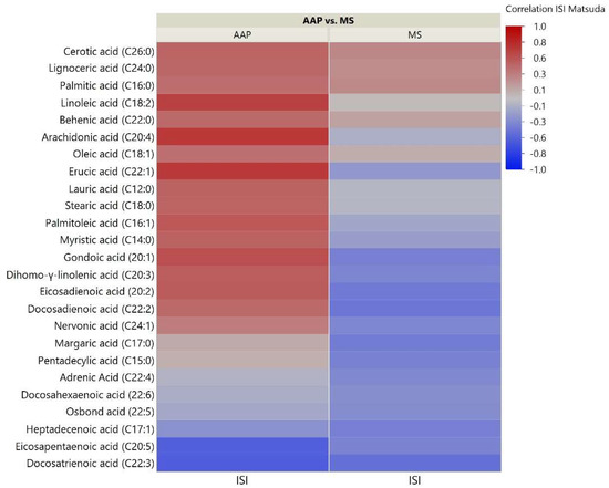 Correlation heatmap of insulin sensitivity and TFAs. The heatmap shows degree of correlation between individual TFA species and insulin sensitivity measured by the Matsuda Insulin Sensitivity Index (ISI). Lipids are ordered by the average ascending correlation value. AAP: atypical antipsychotic, and MS: mood stabilizer.