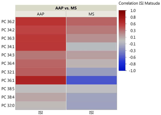 Correlation heatmap of insulin sensitivity and PC Lipids. The heatmap shows degree of correlation between individual PC species and insulin sensitivity measured by the Matsuda ISI. Lipids are ordered by the average ascending correlation value. AAP: atypical antipsychotic, and MS: mood stabilizer.