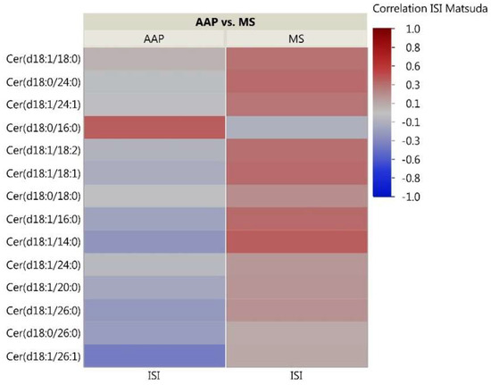 Correlation heatmap of insulin sensitivity and CER lipids. The heatmap shows degree of correlation between individual CER species and insulin sensitivity measured by the Matsuda ISI. Lipids are ordered by the average ascending correlation value. AAP: atypical antipsychotic, and MS: mood stabilizer.
