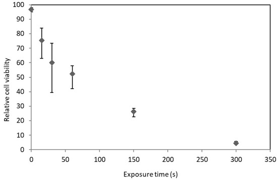 Relative cell viability of D. salina at various exposure times to ultraviolet light in the stationary phase. n = 3. Error bars represent the range. Control at 0 s of irradiation. UVB intensity at 1.5 W/cm2. Carried out as in Materials and Methods. Culture densities approximately 0.7 mg/mL dry weight.