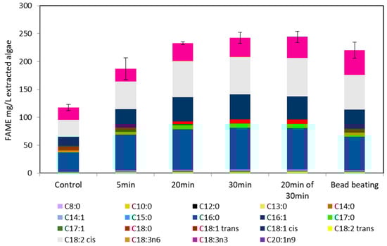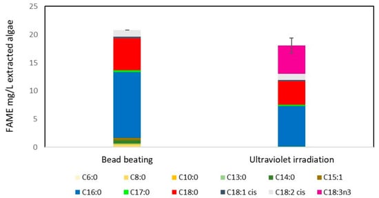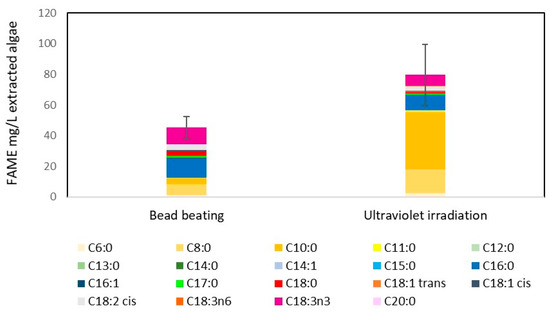 Furthermore, Figure 6 indicates the irradiation duration required was much higher but ultimately successful due to the mechanism by which UV light causes cell disruption, primarily through DNA damage. The smaller, thick cell walled M. inermum cells were successfully disrupted using UV light, given a high enough duration. The data presented in the cases of both C. reinhardtii and M. inermum suggests UV radiation to be a more effective cell disruption method than bead beating for FAME yield. Specifically, the FAME yields from M. inermum indicated UV radiation (30 min) achieved a FAME yield following transesterification of extracted lipid of 226 mg/L extracted algae compared to 208 mg/L extracted algae for bead beating.