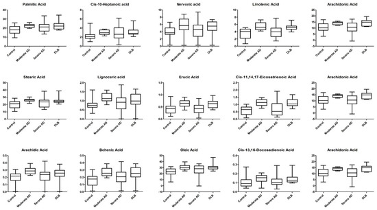 Brain fatty acids (g/kg) significantly altered across moderate Alzheimer’s disease (AD), severe AD, and dementia with Lewy bodies (DLB) groups. A total of 13 brain fatty acid (FA) species were found to be significant across the 4 groups. FA species concentrations are displayed as box-and-whisker plots with maximum and minimum values.