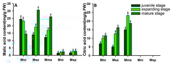 2.2. Variation in Organic Acid Components among Malus Species