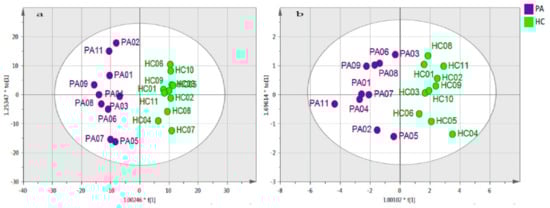 | Putative Metabolite | Pathway | (PA/HC) | p-Value | q-Value | AUC | VIP Total | VIP (Pred./Ortho.) |