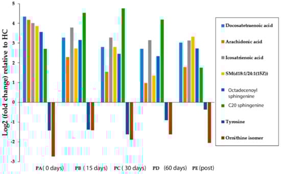 | Mass | RT | Putative Metabolite | p-Value HCPA | PA/HC | p-Value HCPB | PB/HC | p-Value HCPC | PC/HC | p-Value HCPD | D/HC | p-Value HCPE | E/HC |