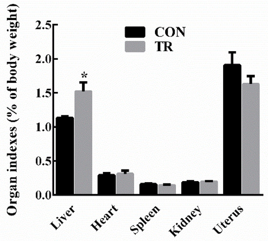 Organ indexes of ewes in the control group (CON, fed at the normal level, n = 10) and treated group (TR, restricted to a 30% level of feed intake, n = 10). Values are means with their standard errors represented by vertical bars. * Mean values with asterisks were significantly different between the two groups (p < 0.05, independent-sample t-test).