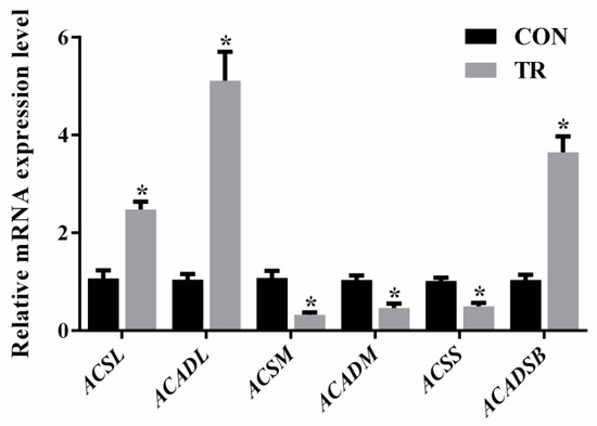 The gene expressions of acyl-CoA synthases and dehydrogenases in the hepatic tissues of ewes in the control group (CON, fed at the normal level, n = 10) and treated group (TR, restricted to a 30% level of feed intake, n = 10). Values are means with their standard errors represented by vertical bars. * Mean values with asterisks were significantly different between the two groups (p < 0.05, independent-sample t-test). ACSL, long-chain acyl-CoA synthase; ACADL, long-chain acyl-CoA dehydrogenase; ACSM, medium-chain acyl-CoA synthase; ACADM, medium-chain acyl-CoA dehydrogenase; ACSS, short-chain acyl-CoA synthase; ACADSB, short and branch-chain acyl-CoA dehydrogenase.