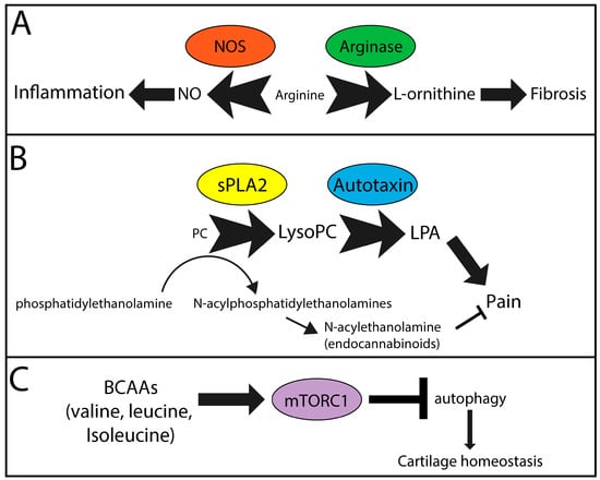 Metabolic pathways likely contributing to symptoms and pathology in OA. (A) Nitric oxide synthase (NOS) and arginase compete for arginine, which is reduced in the OA metabolome, to generate nitric oxide (NO) and l-orninithe, contributors to inflammation and fibrosis, respectively. (B) Secreted phospholipase A2 (sPLA2) catalyzes the conversion of phosphatidylcholine (PC) analogues to lysoPC analogues. Subsequent metabolism of lysoPCs via autotaxin generates lysophosphatidic acid (LPA), a signaling molecule known to promote pain. Furthermore, generation of endocannabinoids from phosphatidylethanolamines requires PC analogues, also contributing to lysoPC production. Resulting endocannabinoids function to reduce pain. (C) Branched chain amino acids (BCAAs) induce mammalian target of rapamycin complex 1 (mTORC1), which inhibits intracellular autophagy, a mechanism that protects cartilage homeostasis. Overall this leads to cartilage destruction and increased chondrocyte cell death. (A–C) Text size indicates concentration/activity of individual factors. Arrow/block arrow thickness indicates the likely relative contribution of each pathway in OA symptom and pathology development.