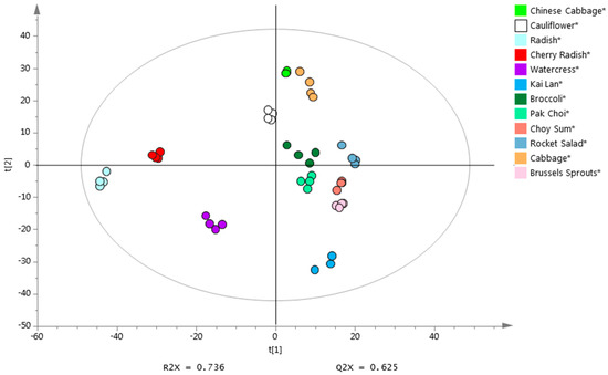 Brassicaceae vegetables, also known as cruciferous vegetables, have attracted increasing research interest because they are among the most commonly consumed vegetables globally, and have been demonstrated to have substantial human health benefits [12]. Recent studies on VOCs emitted from Brassicaceae vegetables have been dedicated to characterizing the vegetables, identifying the aroma components, and evaluating the quality of vegetables, such as VOCs in watercress [13], radish [14], Korean cabbage [15], Brussels sprouts and cauliflower during blanching [16], Brussels sprouts damaged by caterpillars [17], broccoli under ambient and elevated atmospheric CO2 concentrations [18] and rocket during the post-harvest storage [19]. However, most of these studies focused mainly on the fingerprint of VOCs in a single species, so there is still a lack of comprehensive comparison of VOCs profiles in commonly consumed Brassicaceae vegetables. As volatile metabolites in vegetables, VOCs are typical end products in the related metabolic pathways. For example, studies revealed that the glucosinolates (GLSs) in Brassicaceae vegetables could be enzymatically broken down to form isothiocyanates (ITCs), which are typical vegetable VOCs [7,20]. The VOCs profiles may reflect differences in metabolic pathways among various vegetables. In Brassicaceae vegetables, the correlation of VOCs and the possible metabolic pathways for the formation and emission of VOCs are yet to be systematically investigated.