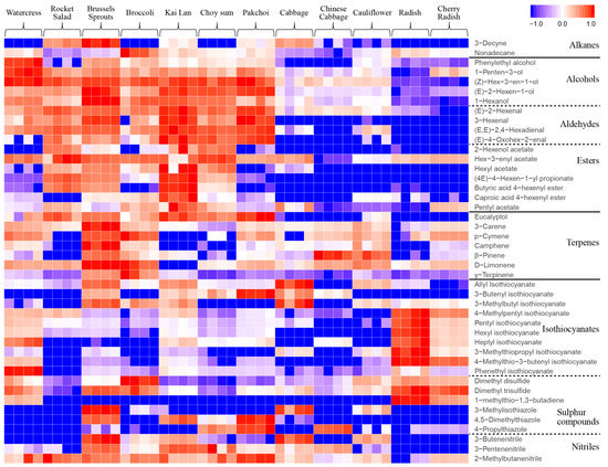 Heatmap of VOCs emitted from 12 Brassicaceae vegetables. The levels of each VOC in the 12 vegetables were normalized in the range of −1 to 1. Blue (−1) and red (1) represent the lowest and highest levels, respectively.