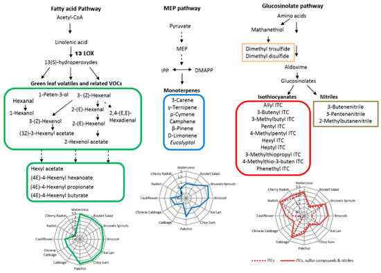 Based on the literature, there are several biosynthetic pathways leading to the diverse range of plant VOCs. The three main metabolic pathways involved in the formation of the identified VOCs in this study are summarized in Figure 3. The metabolic pathways included fatty acid pathway (for secondary volatile metabolites, e.g., GLVs), MEP pathway (for terpenes), and glucosinolate pathway (for ITCs/nitriles). The GLVs are known to be produced from C18 unsaturated fatty acids including linoleic acid or linolenic acid through the lipoxygenase (LOX) pathway [1]. Our results showed that green leafy vegetables (e.g., watercress, rocket, Brussels sprouts, broccoli, kai lan, choy sum, and pak choi) generated more GLVs, indicating that the LOX pathway may behave differently between these green leafy vegetables and others. Monoterpenes are synthesized mainly by the MEP pathway in plastids [1], and our results showed that Brussels sprouts and broccoli may generate more monoterpenes than other vegetables through this pathway. ITCs and nitriles are hydrolysis products of GLSs in plants, which are metabolized from their corresponding precursor amino acids such as alanine, leucine and methionine [27]. Methionine is also the precursor of numerous sulphide compounds including dimethyl trisulfide and dimethyl disulphide [28]. In our study, radish, cherry radish, cabbage, watercress and Brussels sprouts emitted higher levels of volatile ITCs, and broccoli, Chinese cabbage and cauliflower emitted higher levels of nitriles and sulphur compounds.