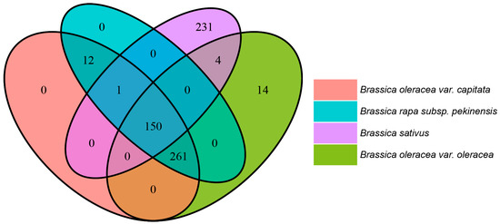 Metabolic pathway differences in Brassica oleracea var. capitata, Brassica oleracea var. oleracea, Raphanus sativus and Brassica rapa subsp. Pekinensis based on comparative genomics. The Venn diagram shows the similarity and differences between metabolic pathways among the four plant species: Brassica oleracea var. capitata (in orange), Brassica olearacea var. oleracea (in green), Brassica rapa subsp. Pekinensis (in blue, using PlantCyc databases) and Raphanus sativus (in violet, using RadishBase). The numbers in these Venn diagram represent the numbers of shared and unique metabolic pathways and sub-pathways in these species.