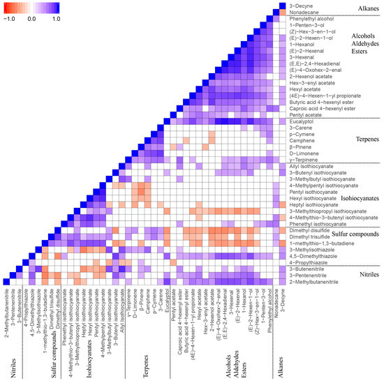 Spearman correlations of identified VOCs in 12 Brassicaceae vegetables. Correlation coefficients (r) were in the range of −1 to 1. Only significant correlations (p < 0.05) are shown in the heatmap. Blue (r = −1) and red (r = 1) represent the most significantly negative and positive correlations, respectively. White (0) represents no significant correlation.