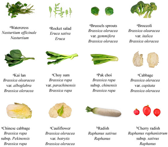 Based on earlier studies [16,46] and vegetable consumption patterns in the Asian region, we chose the 12 most commonly consumed Brassicaceae vegetables in this study (Figure 6). These vegetables were purchased from a local supermarket daily and analysed the same day. The edible part of each vegetable was chosen for analysis (leaves: cabbage, Chinese cabbage, Brussels sprouts, pak choi and rocket; leaves and stems: choy sum and kai lan; florets: broccoli and cauliflower; roots: radish and cherry radish.